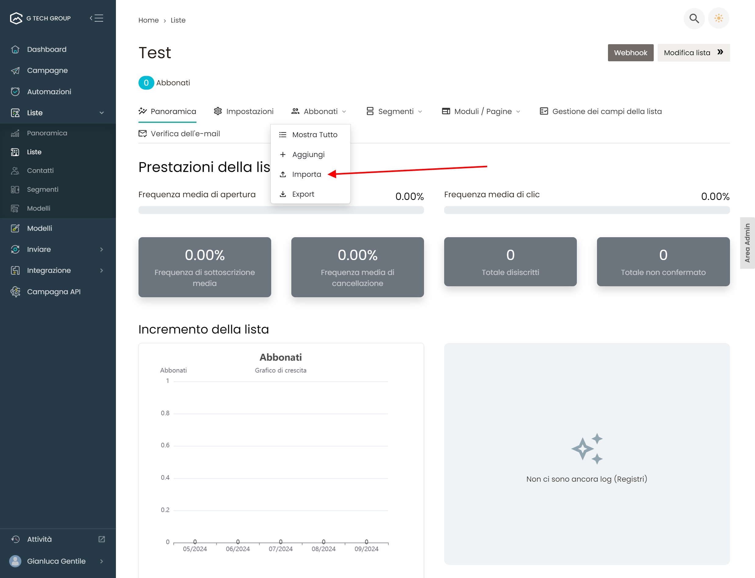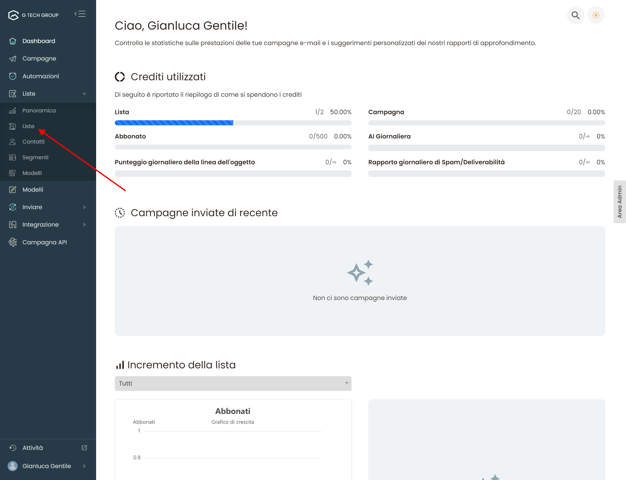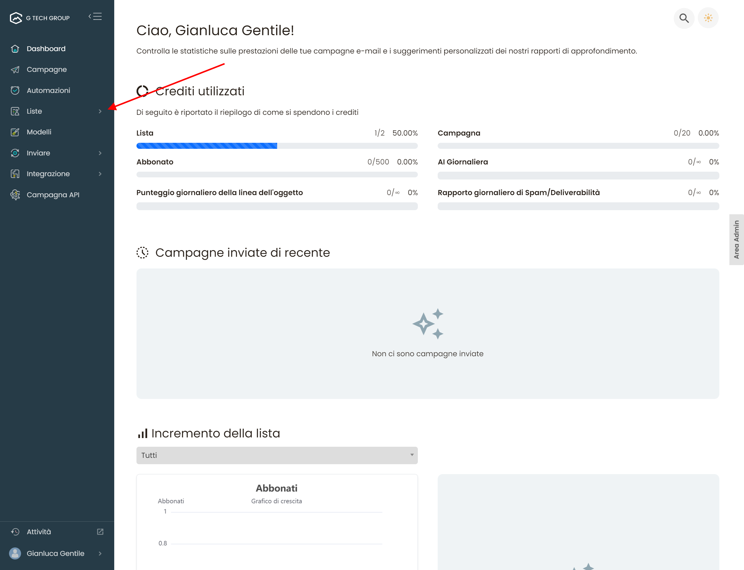 Per importare il file, è necessario andare nel menu laterale e cliccare su "Liste".