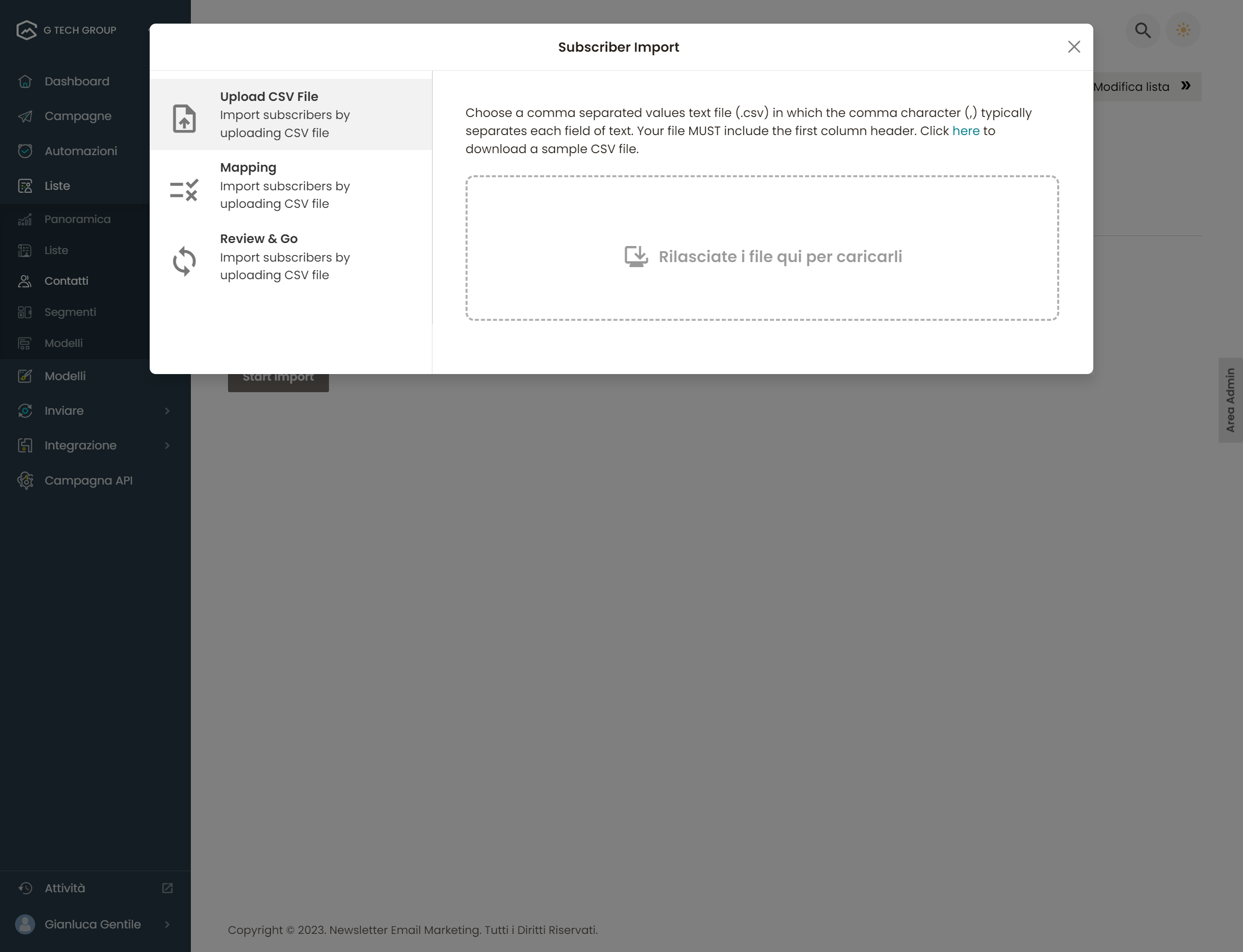 Da questa schermata possiamo scaricare il file Sample.csv aggiornato o iniziare subito l'importazione della nostra lista contatti.