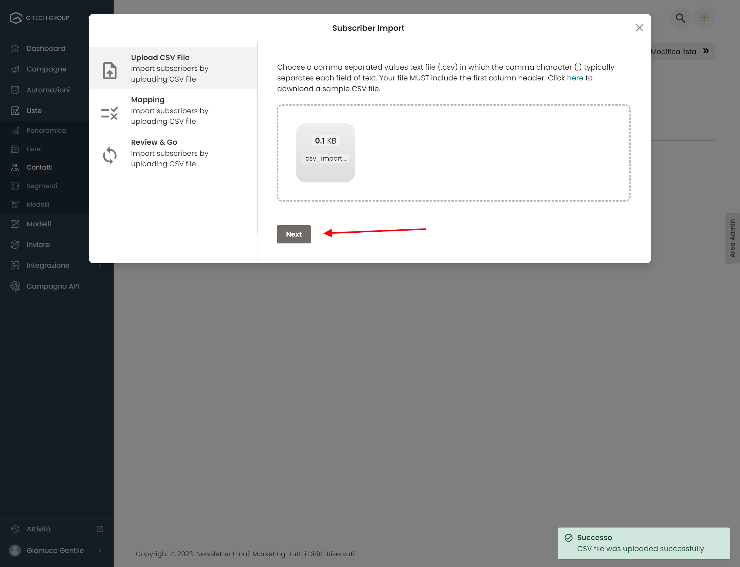 Dopo aver caricato il file Excel, clicchiamo su "Next" per passare al terzo step.
