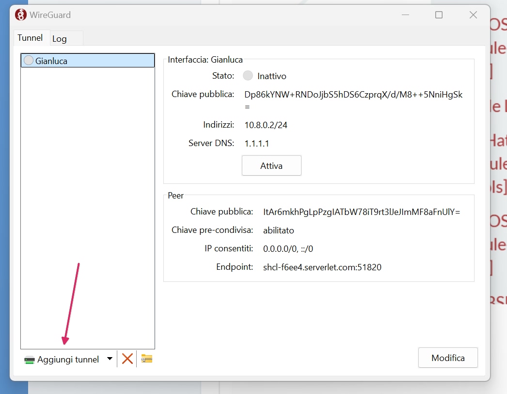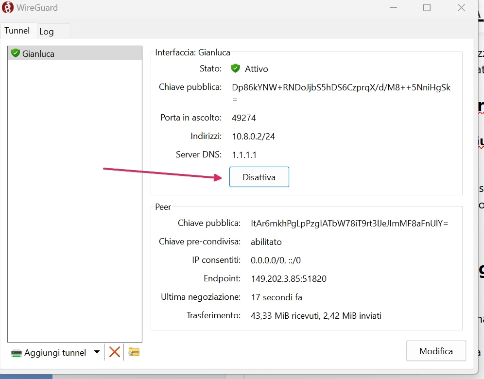 - Per riaccedere in futuro, apri WireGuard e clicca su "Attiva".